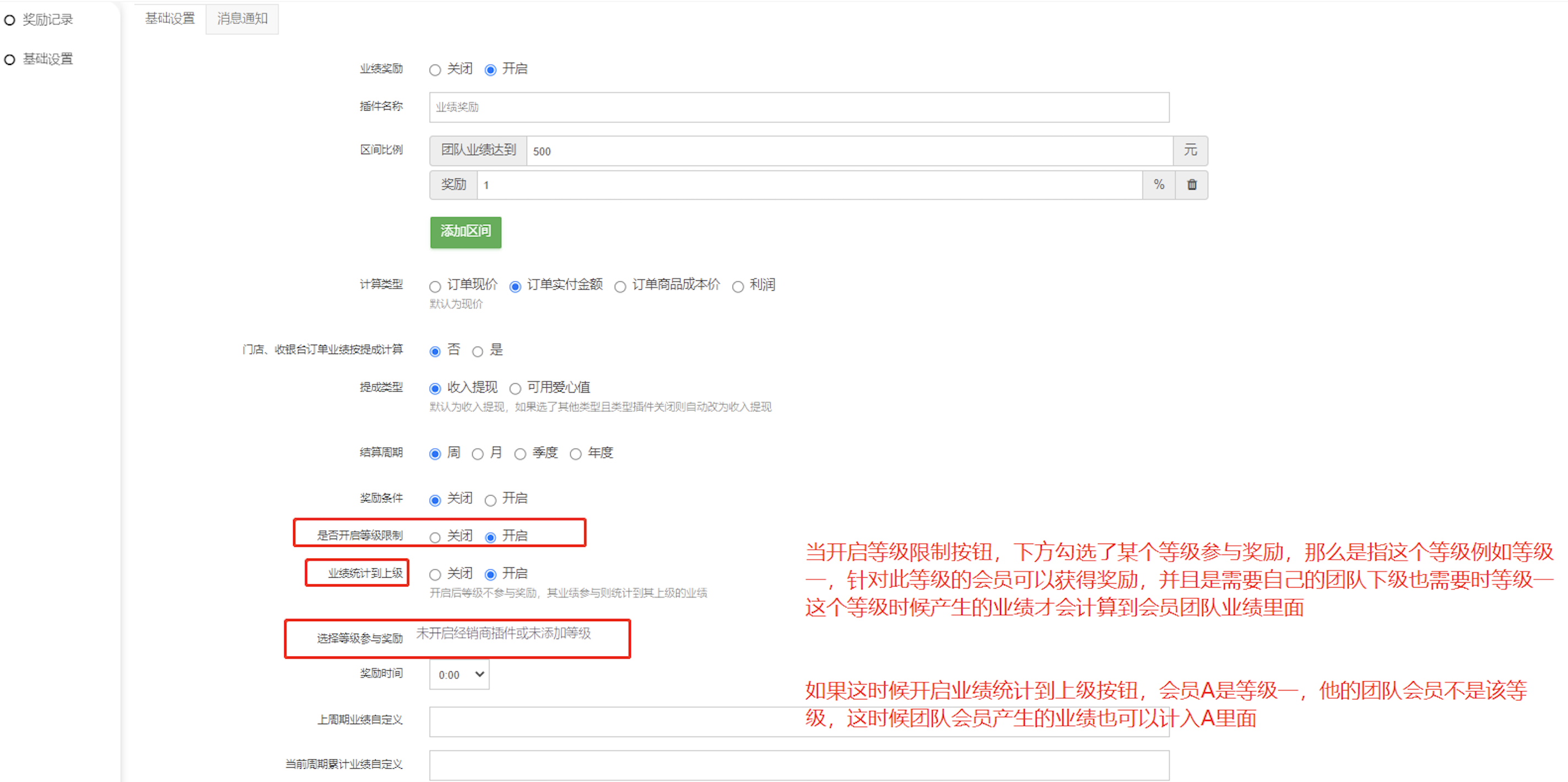 是否开启业绩统计到上级:开启业绩统计到上级需配合开启等级限制使用的。当开启等级限制,勾选的等级才会参与奖励,不勾选的等级不参与奖励也不会统计不勾选等级的业绩,这时候开启业绩统计到上级按钮,开启这个按钮后针对不勾选的等级产生的业绩就可以统计到上级业绩中去计算奖励。