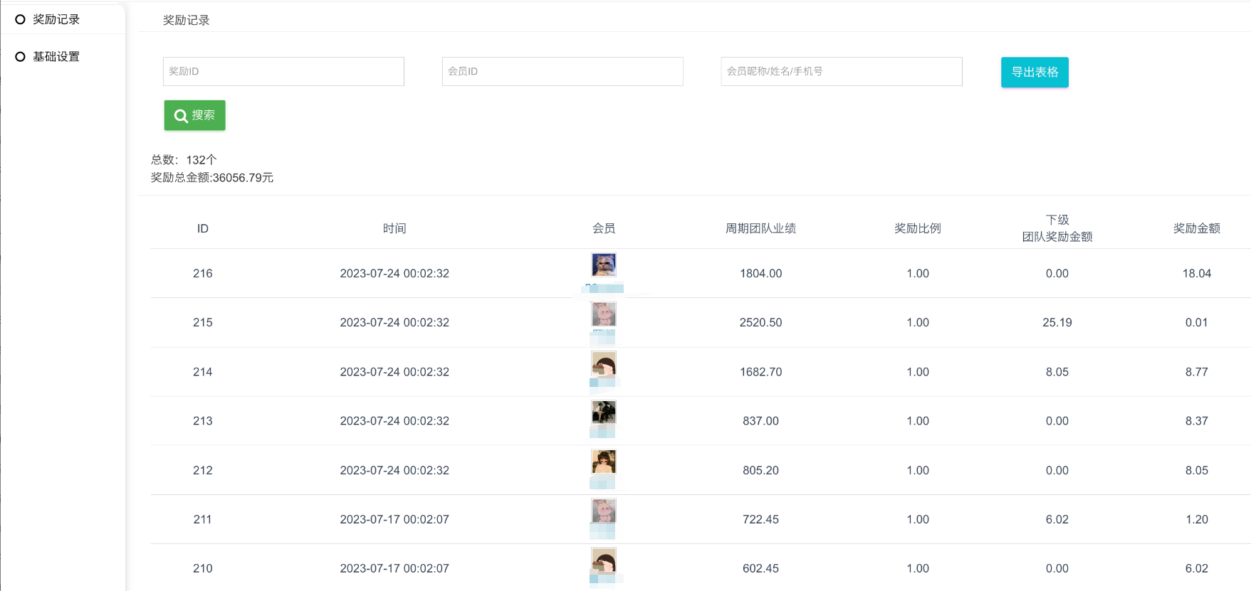 会员获得业绩奖励后后台就会有奖励记录